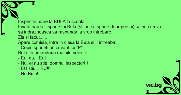 Invatatoarea ii spune lui Bula (stiind ca spune doar prostii) sa nu cumva sa indrazneasca sa raspunda la vreo intrebare.