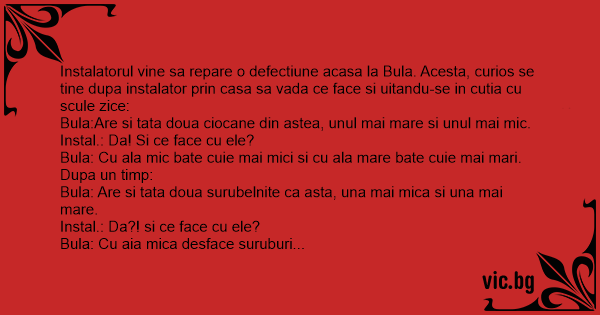 Instalatorul vine sa repare o defectiune acasa la Bula. Acesta, curios se tine dupa instalator prin casa sa vada ce face si uitandu-se in cutia cu scule zice: