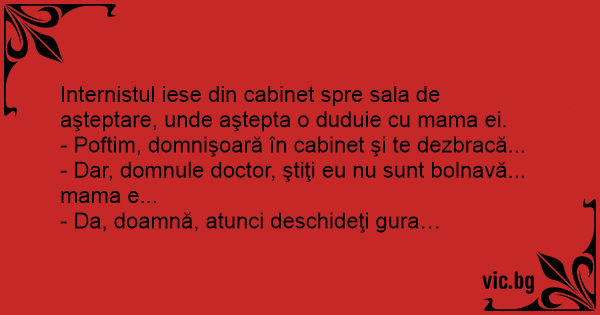 Internistul iese din cabinet spre sala de aşteptare, unde aştepta o duduie cu mama ei.