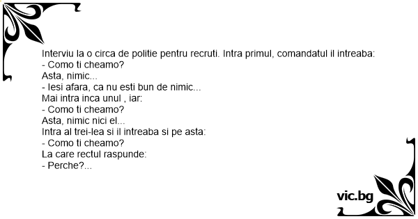 Interviu la o circa de politie pentru recruti. Intra primul, comandatul il intreaba: