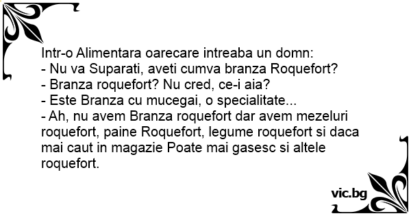 - Ah, nu avem Branza roquefort dar avem mezeluri roquefort, paine Roquefort, legume roquefort si daca mai caut in magazie Poate mai gasesc si altele roquefort.