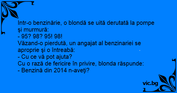 Intr-o benzinărie, o blondă se uită derutată la pompe şi murmură:
