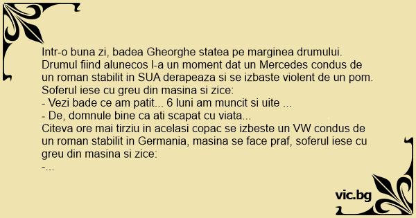Intr-o buna zi, badea Gheorghe statea pe marginea drumului. Drumul fiind alunecos l-a un moment dat un Mercedes condus de un roman stabilit in SUA derapeaza si se izbaste violent de un pom. Soferul iese cu greu din masina si zice: