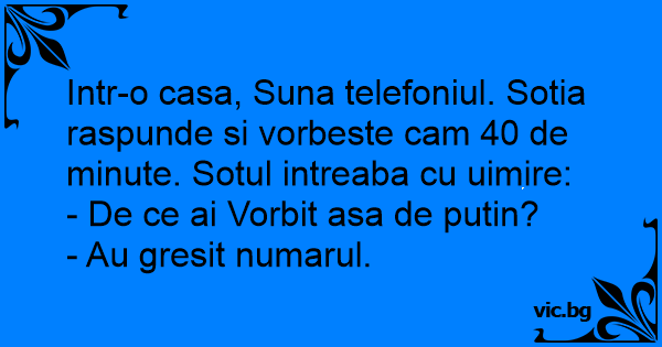 Intr-o casa, Suna telefoniul. Sotia raspunde si vorbeste cam 40 de minute. Sotul intreaba cu uimire: