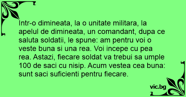 Intr-o dimineata, la o unitate militara, la apelul de dimineata, un comandant, dupa ce saluta soldatii, le spune: am pentru voi o veste buna si una rea. Voi incepe cu pea rea. Astazi, fiecare soldat va trebui sa umple 100 de saci cu nisip. Acum vestea cea buna: sunt saci suficienti pentru fiecare.