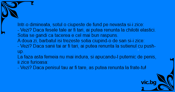 La faza asta femeia nu mai indura, si apucandu-l puternic de реnis, ii zice furioasa: