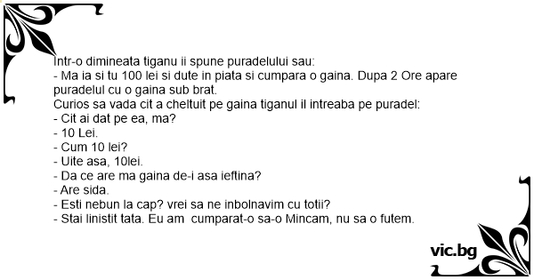 - Ma ia si tu 100 lei si dute in piata si cumpara o gaina. Dupa 2 Ore apare puradelul cu o gaina sub brat.