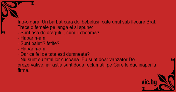 - Nu sunt eu tatal lor cucoana. Eu sunt doar vanzator De prezervative, iar astia sunt doua reclamatii pe Care le duc inapoi la firma.