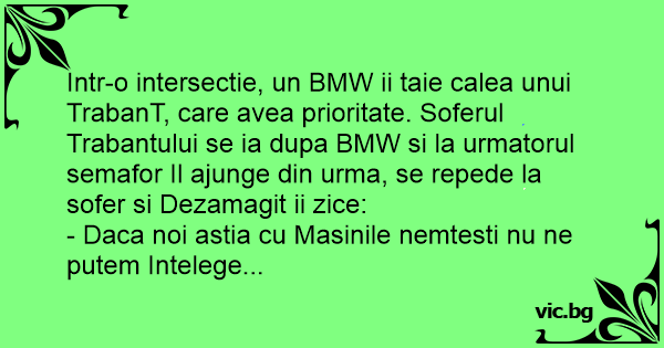 Intr-o intersectie, un BMW ii taie calea unui TrabanT, care avea prioritate. Soferul Trabantului se ia dupa BMW si la urmatorul semafor Il ajunge din urma, se repede la sofer si Dezamagit ii zice: