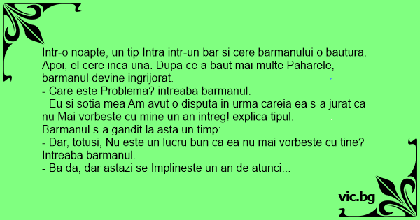 - Eu si sotia mea Am avut o disputa in urma careia ea s-a jurat ca nu Mai vorbeste cu mine un an intreg! explica tipul.