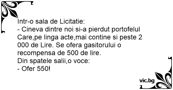 - Cineva dintre noi si-a pierdut portofelul Care,pe linga acte,mai contine si peste 2 000 de Lire. Se ofera gasitorului o recompensa de 500 de lire.