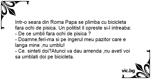 Intr-o seara din Roma Papa se plimba cu bicicleta fara ochi de pisica. Un politist il opreste si-l intreaba: