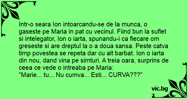 Intr-o seara Ion intoarcandu-se de la munca, o gaseste pe Maria in pat cu vecinul. Fiind bun la suflet si intelegator, Ion o iarta, spunandu-i ca fiecare om greseste si are dreptul la o a doua sansa. Peste catva timp povestea se repeta dar cu alt barbat. Ion o iarta din nou, dand vina pe simturi. A treia oara, surprins de ceea ce vede o intreaba pe Maria: