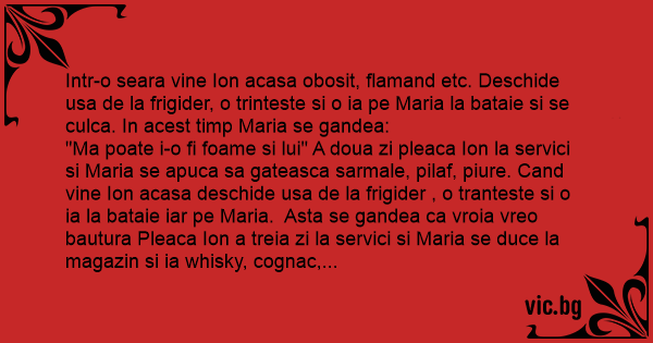 "Ma poate i-o fi foame si lui" A doua zi pleaca Ion la servici si Maria se apuca sa gateasca sarmale, pilaf, piure. Cand vine Ion acasa deschide usa de la frigider , o tranteste si o ia la bataie iar pe Maria. Asta se gandea ca vroia vreo bautura Pleaca Ion a treia zi la servici si Maria se duce la magazin si ia whisky, cognac, palinca, bere, tuica. Cand vine Ion seara acasa deschide usa de la frigider, o tranteste si o ia la bataie pe Maria (ouch!) Ea, cu un picior fracturat, statea sa se gandeasca "Ma, poate vrea o prajitura" Pleaca Ion la servici si Maria se apuca sa faca torturi, prajituri, placinte Cand vine Ion acasa deschide usa de la frigider, o tranteste si it tipa Mariei"Faaaaaaaaaaaaaaa!De cate ori ti-am spus sa stingi becul dela frigider ca facem economie!"
