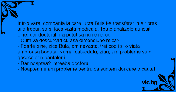 Intr-o vara, compania la care lucra Bula l-a transferat in alt oras si a trebuit sa-si faca vizita medicala. Toate analizele au iesit bine, dar doctorul n-a putut sa nu remarce: