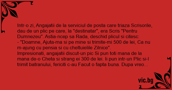 Intr-o zi, Angajatii de la serviciul de posta care triaza Scrisorile, dau de un plic pe care, la "destinatar", era Scris "Pentru Dumnezeu". Astia-ncep sa Rada, deschid plicul si citesc:
