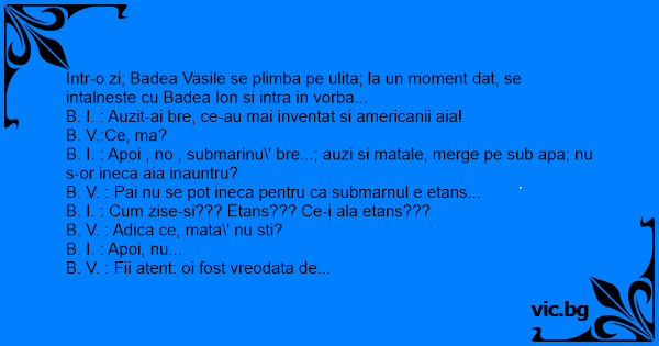 Intr-o zi, Badea Vasile se plimba pe ulita; la un moment dat, se intalneste cu Badea Ion si intra in vorba...