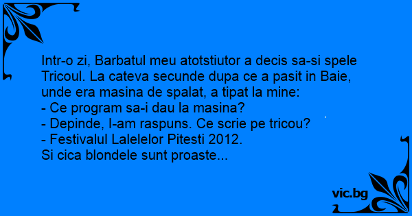Intr-o zi, Barbatul meu atotstiutor a decis sa-si spele Tricoul. La cateva secunde dupa ce a pasit in Baie, unde era masina de spalat, a tipat la mine: