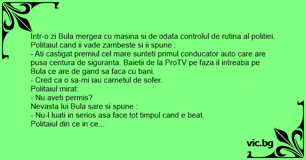 Dupa 5 ore de urmarire cu masina, un politist reuseste sa-l Opreasca pe Ion: - Stimate domn, as dori sa va felicit, deoarece nu ati Comis nici o greseala de circulatie si sa va premiez cu 5...