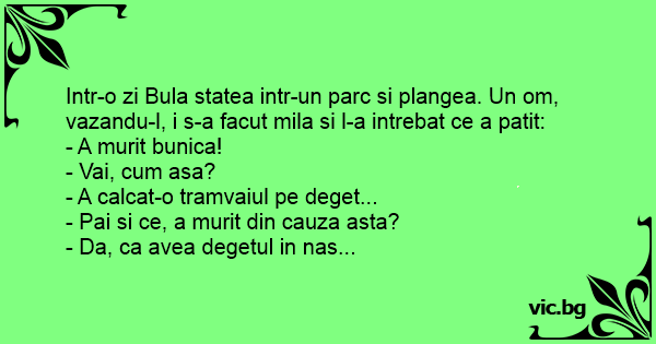 Intr-o zi Bula statea intr-un parc si plangea. Un om, vazandu-l, i s-a facut mila si l-a intrebat ce a patit: