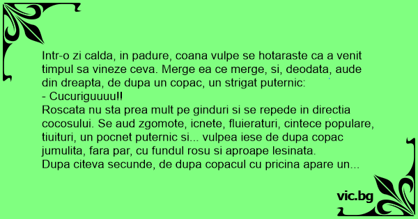 Intr-o zi calda, in padure, coana vulpe se hotaraste ca a venit timpul sa vineze ceva. Merge ea ce merge, si, deodata, aude din dreapta, de dupa un copac, un strigat puternic:
