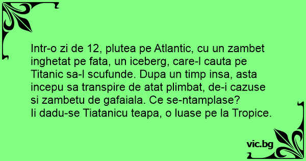 Intr-o zi de 12, plutea pe Atlantic, cu un zambet inghetat pe fata, un iceberg, care-l cauta pe Titanic sa-l scufunde. Dupa un timp insa, asta incepu sa transpire de atat plimbat, de-i cazuse si zambetu de gafaiala. Ce se-ntamplase?