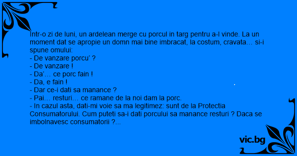 - In cazul asta, dati-mi voie sa ma legitimez: sunt de la Protectia Consumatorului. Сuм puteti sa-i dati porcului sa manance resturi ? Daca se imbolnavesc consumatorii ? Un million de lei amenda ! A doua saptamana, iar vine ardeleanul cu porcul in targ. De el se apropie un alt domn bine imbracat, care-l intreaba: