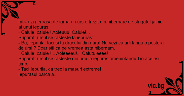 - Ba, Iepurila, taci si tu dracului din gura! Nu vezi ca urli langa o pestera de ursi ? Doar stii ca pe vremea asta hibernam.