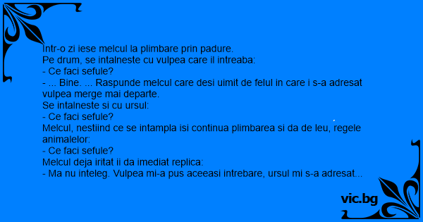 - Ma nu inteleg. Vulpea mi-a pus aceeasi intrebare, ursul mi s-a adresat la fel, si acum tu, regele animalelor, imi spune "ce faci sefule?".