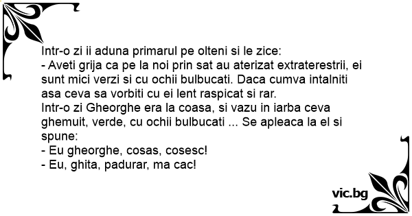 - Aveti grija ca pe la noi prin sat au aterizat extraterestrii, ei sunt mici verzi si cu ochii bulbucati. Daca cumva intalniti asa ceva sa vorbiti cu ei lent raspicat si rar.