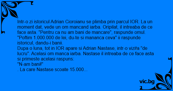 Intr-o zi istoricul Adrian Cioroianu se plimba prin parcul IOR. La un moment dat, vede un om mancand iarba. Oripilat, il intreaba de ce face asta. "Pentru ca nu am bani de mancare", raspunde omul. "Poftim 1.000.000 de lei, du-te si mananca ceva" ii raspunde istoricul, dandu-i banii.