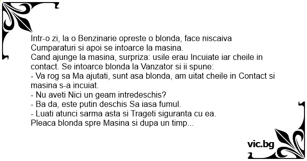 Cand ajunge la masina, surpriza: usile erau Incuiate iar cheile in contact. Se intoarce blonda la Vanzator si ii spune: