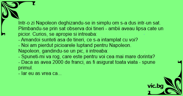 Intr-o zi Napoleon deghizandu-se in simplu om s-a dus intr-un sat. Plimbandu-se prin sat observa doi tineri - ambii aveau lipsa cate un picior. Curios, se apropie si intreaba:
