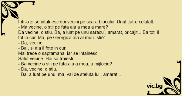 Intr-o zi se intalnesc doi vecini pe scara blocului. Unul catre celalalt: