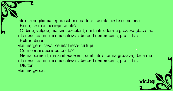 - Hai salut iepurasule, am auzit ca-ti merge nemaipomenit, ce mai faci?