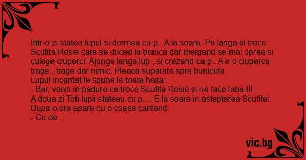 Intr-o zi statea lupul si dormea cu p.. A la soare. Pe langa el trece Scufita Rosie care se ducea la bunica dar mergand se mai oprea si culege ciuperci. Ajunge langa lup , si crezand ca p.. A e o ciuperca trage , trage dar nimic. Pleaca suparata spre bunicuta.