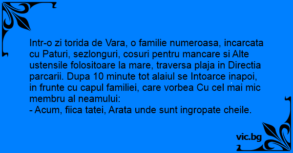 Intr-o zi torida de Vara, o familie numeroasa, incarcata cu Paturi, sezlonguri, cosuri pentru mancare si Alte ustensile folositoare la mare, traversa plaja in Directia parcarii. Dupa 10 minute tot alaiul se Intoarce inapoi, in frunte cu capul familiei, care vorbea Cu cel mai mic membru al neamului: