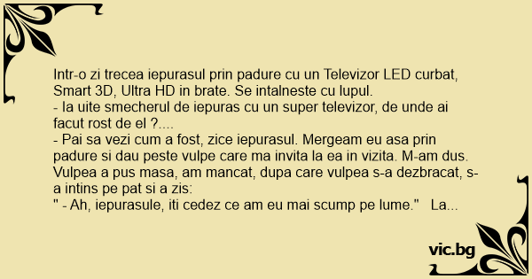" - Ah, iepurasule, iti cedez ce am eu mai scump pe lume." La care eu m-am uitat in jur si am luat televizorul asta!