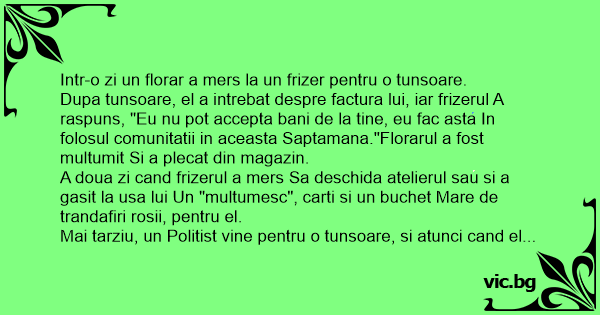 Dupa tunsoare, el a intrebat despre factura lui, iar frizerul A raspuns, "Eu nu рот accepta bani de la tine, eu fac asta In folosul comunitatii in aceasta Saptamana."Florarul a fost multumit Si a plecat din magazin.