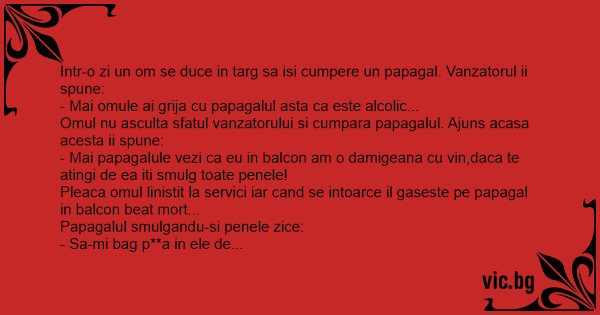 Pleaca omul linistit la servici iar cand se intoarce il gaseste pe papagal in balcon beat mort...