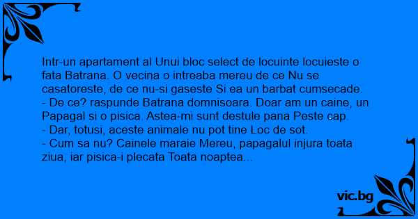 - De ce? raspunde Batrana domnisoara. Doar am un caine, un Papagal si o pisica. Astea-mi sunt destule pana Peste cap.