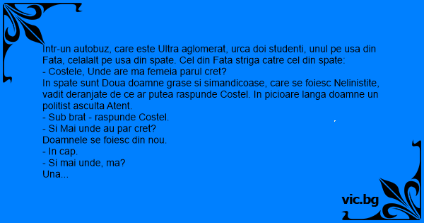 Intr-un autobuz, care este Ultra aglomerat, urca doi studenti, unul pe usa din Fata, celalalt pe usa din spate. Cel din Fata striga catre cel din spate: