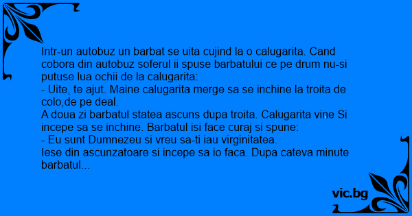 Intr-un autobuz un barbat se uita cujind la o calugarita. Cand cobora din autobuz soferul ii spuse barbatului ce pe drum nu-si putuse lua ochii de la calugarita: