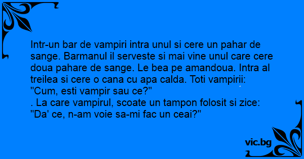 Intr-un bar de vampiri intra unul si cere un pahar de sange. Barmanul il serveste si mai vine unul care cere doua pahare de sange. Le bea pe amandoua. Intra al treilea si cere o cana cu apa calda. Toti vampirii: