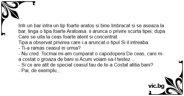 Intr-un bar intra un tip foarte aratos si bine Imbracat si se aseaza la bar, linga o tipa foarte Aratoasa. ii arunca o privire scurta tipei, dupa Care se uita la ceas foarte atent si concentrat.