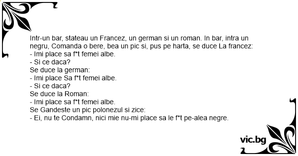 Intr-un bar, stateau un Francez, un german si un roman. In bar, intra un negru, Comanda o bere, bea un pic si, pus pe harta, se duce La francez: