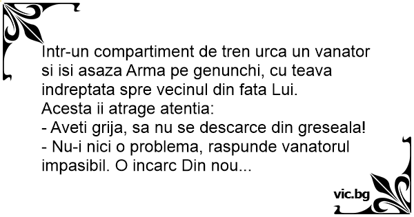Intr-un compartiment de tren urca un vanator si isi asaza Arma pe genunchi, cu teava indreptata spre vecinul din fata Lui.