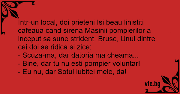 Intr-un local, doi prieteni Isi beau linistiti cafeaua cand sirena Masinii pompierilor a inceput sa sune strident. Brusc, Unul dintre cei doi se ridica si zice: