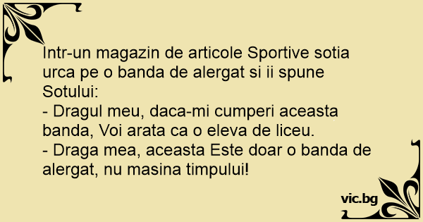 Intr-un magazin de articole Sportive sotia urca pe o banda de alergat si ii spune Sotului: