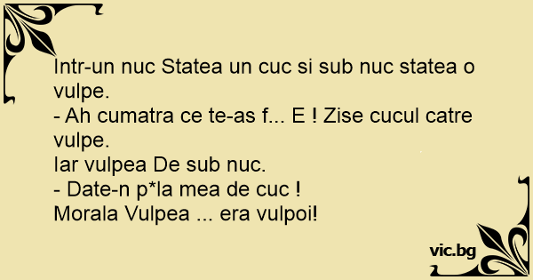 - Ah cumatra ce te-as f... E ! Zise cucul catre vulpe.